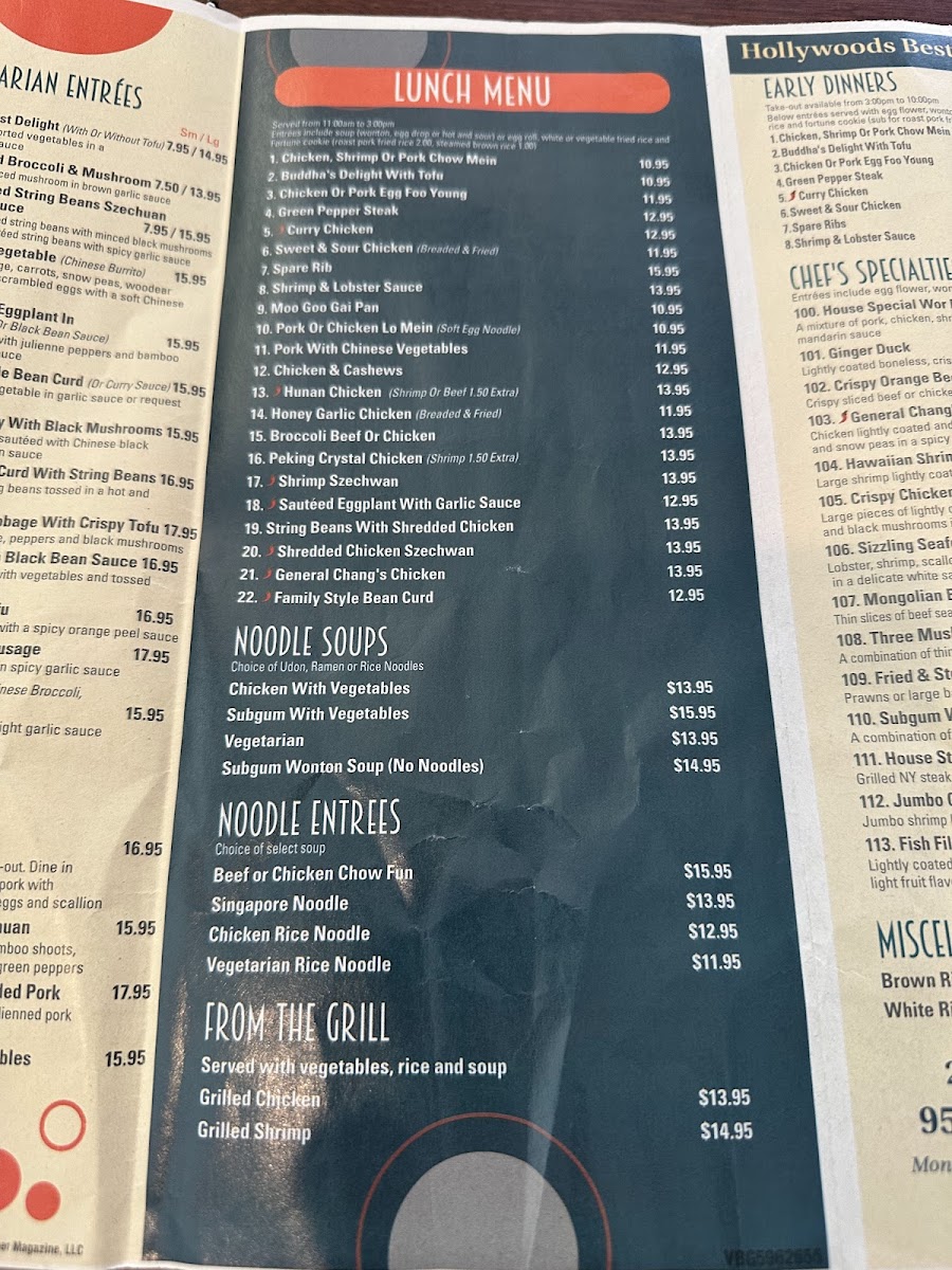 Served with egg flower, wonton or hot and sour soup, egg roll, white or vegetable fried rice and fortune cookie (roast pork fried rice, brown rice for an additional price). All entrées include white rice, MSG and cornstarch and can be omitted upon request. Spicy hot entrées (degree of spice as requested). Take-out available from 3:00 pm to 10:00 pm.